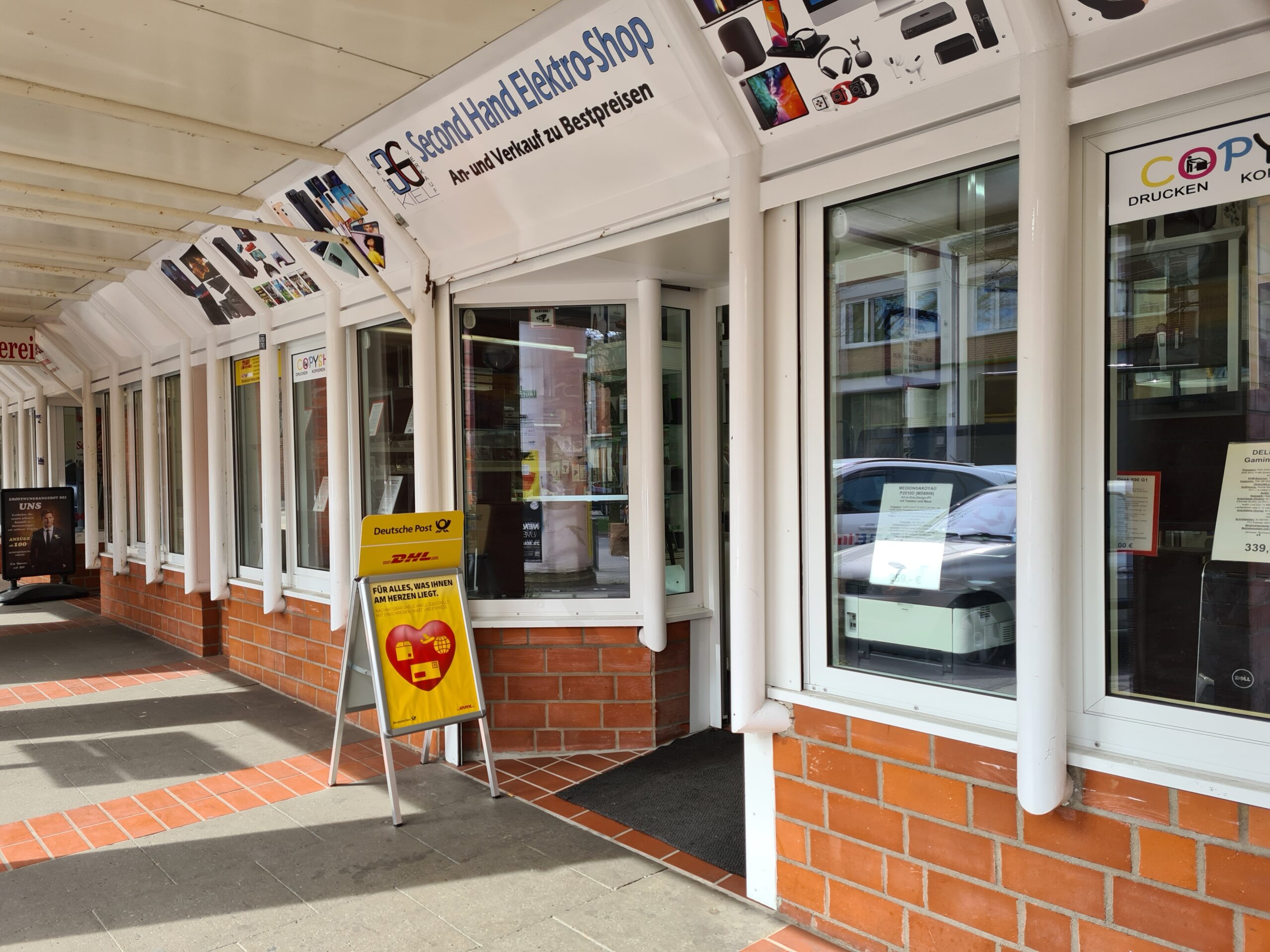 Die Postfiliale in der Herzog-Friedrich-Straße ist ein Second-Hand-Laden für Kommunikationselektronik, immer sehr nett und hilfreich. Die Laptops und Smartphones müssen jetzt etwas zur Seite rücken, damit der gelbe „Schalter“ Platz hat: